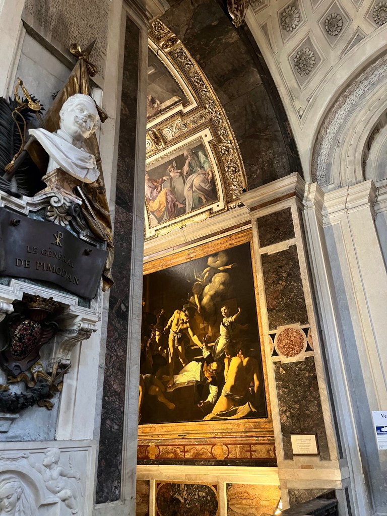 Yesterday, we went to the church of San Luigi Francese, aka Saint Louis the French, to see the Caravaggios so beautifully shown in Ripley. (Nothing like watching American tourists in Italy while being American tourists in Italy! I love the original movie, but I also really love this new show.) Then we ate at the favorite Roman restaurant of my mom’s friend Eve, the author of the incredible treasure hunt we’ve been using to explore and learn more about the Eternal City. The boys and I shopped the Campo di Fiori for gifts and bulk candy afterwards. The boys each got little bags of pasta with souvenir spoons for friends, and I found a gorgeous black silk dress that I’ll wear at the BMOP concert next week (NEXT WEEK!).